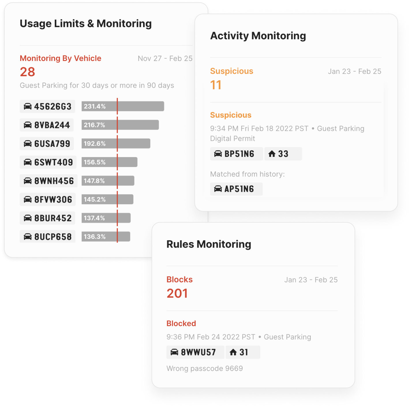 Thanks to our updated parking enforcement software, you gain more data about the people parking in your property — especially suspicious vehicles. These metrics help you know who is: